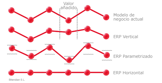 A modo de resumen en esta imagen podemos ver de forma esquemática el modelo de negocio de una empresa, y cómo los distintos tipos de ERP pueden ajustarse a él. El ERP vertical está enfocado claramente al sector del negocio, por lo que las similitudes son evidentes. No obstante, puede haber pequeñas peculiaridades en nuestro modelo de negocio distintas al resto que nos otorgan un valor añadido, el cual vamos a perder al aplicar el ERP vertical y adecuarnos a su estándar. Si analizamos el ERP parametrizado vemos que nos ofrece una serie de rangos para amoldar el ERP a muestro modelo de negocio. Es posible que el rango que ofrece no sea lo suficientemente amplio como para cubrir las necesidades de nuestro modelo de negocio actual, pero sí nos permitirá que el resultado final que obtengamos sea parecido al modelo inicial. Por último el ERP horizontal ofrece una serie de funcionalidades estándar que, aunque no están adecuadas a nuestro modelo de negocio, sí nos acercan al estándar y nos sirven para implementar las operaciones más básicas de la empresa.