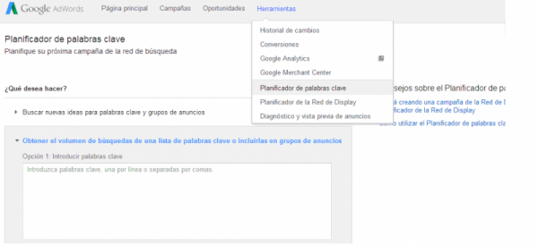 Lo primero que debemos hacer después de entrar en la página de AdWords es hacer clic en la herramienta que usaremos tal y como se ve en la siguiente imagen.