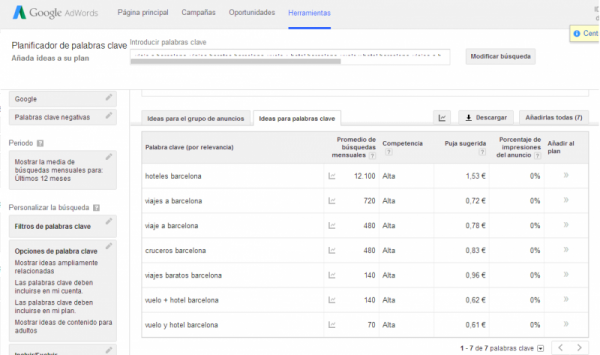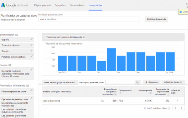 En la imagen anterior podemos ver como gracias a AdWords hemos descubierto que “viajes a Barcelona” tiene más búsquedas mensuales que “viaje a Barcelona” (en singular). Si no encontramos las palabras adecuadas, corremos el riesgo de que nuestro negocio no sea visible al público. Si no trabajamos las palabras adecuadas en nuestro sitio, corremos el riesgo de que nuestro negocio pase desapercibido al público o, por el contrario, el sitio web sea encontrado por un público que no se corresponde con nuestro objetivo.
